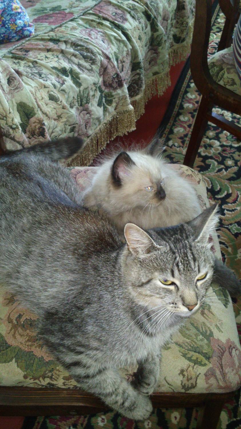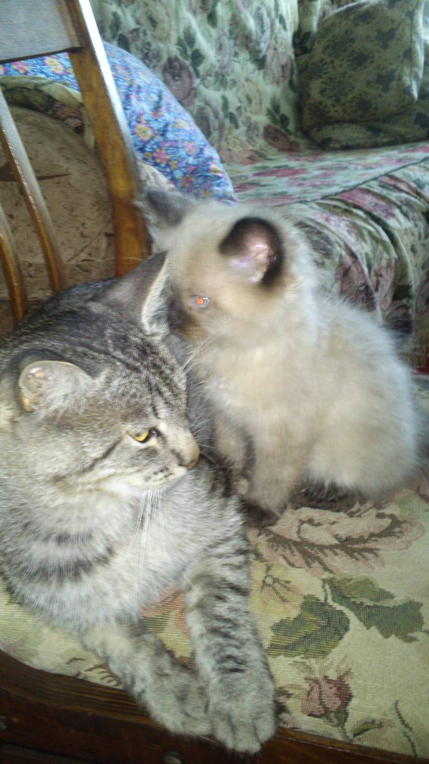 | воительница, еще как признал!!! Это он его умывает!! Просто на фото не видно.. А потом Пухлик новоявленного папку умывал!