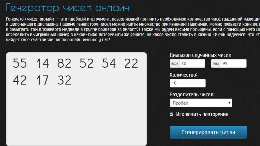 Каждый, кто хочет проверить, насколько он удачлив, должен написать 9 любых ДВУХЗНАЧНЫХ чисел разделённых пробелом от 10 до 99 без повторов (по одной комбинации за игру, т.е 9 чисел за одну игру).