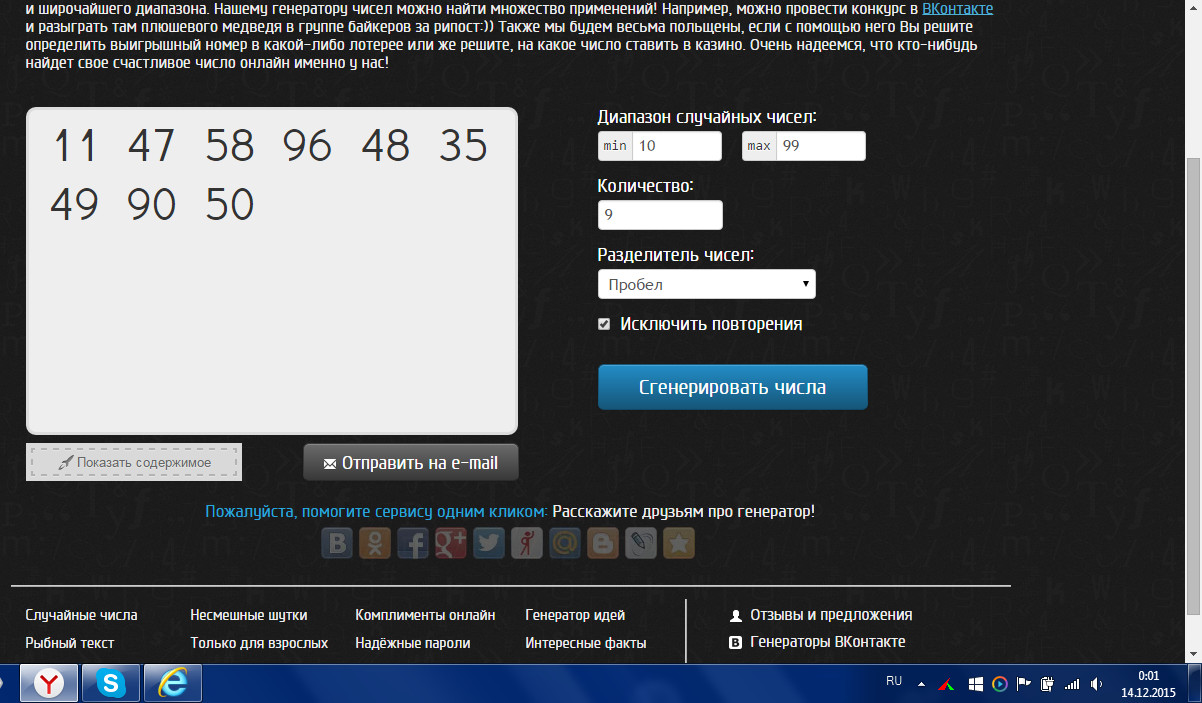 |  Я хочу предложить вот какую игру: Лотерея. Я давно думал про что-то на подобии русского лото, но как это реализовать на сайте (карточки, бочонки сложно). Поэтому наткнувшись на генератор чисел с возможностью выбора: диапазона чисел, количества, быть повторениям или нет. Я предлагаю вот какую лотерею: