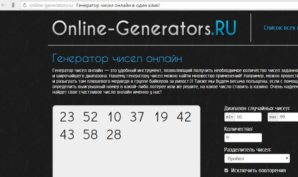 Каждый, кто хочет проверить, насколько он удачлив, должен написать 9 любых ДВУХЗНАЧНЫХ чисел разделённых пробелом от 10 до 99 без повторов (по одной комбинации за игру, т.е 9 чисел за одну игру).