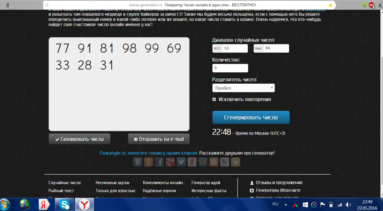 Каждый, кто хочет проверить, насколько он удачлив, должен написать 9 любых ДВУХЗНАЧНЫХ чисел разделённых пробелом от 10 до 99 без повторов (по одной комбинации за игру, т.е 9 чисел за одну игру).